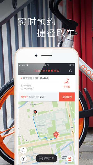 开锁指南:在每辆摩拜单车的车身,车把与锁上都印有二维码,您只需用手机简单一扫,车锁就会自动打开。