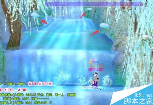 采集瀑布上方的雨云需要跳跃上去或者使用轻功键如图水面上方的箭头所指的就是仙界雨云