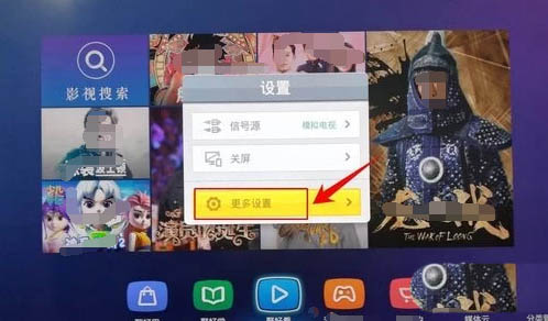 1、大家可以先在电视上,在“设置”的页面中,找到“更多设置”。