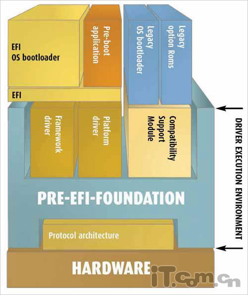 对于操作系统来说,如果主板使用的是BIOS,那么操作系统就必须面对所有的硬件,大到主板显卡,小到鼠标键盘,每次重装系统或者系统升级,都必须手动安装新的驱动,否则硬件很可能无法正常工作。而基于EFI的主板则方便很多,因为EFI架构使用的驱动基于EFI Byte Code。EFI Byte Code有些类似于Java的中间代码,并不由CPU直接执行操作,而是需要EFI层进行翻译。对于不同的操作系统来说,EFI将硬件层很好地保护了起来,所有操作系统看到的,都只是EFI留给EFI Byte Code的程序接口,而EFI Byte Code又直接和Windows的API联系,这就意味着无论操作系统是Windows还是Linux,只要有EFI Byte Code支持,只需要一份驱动程序就能吃遍所有操作系统平台。